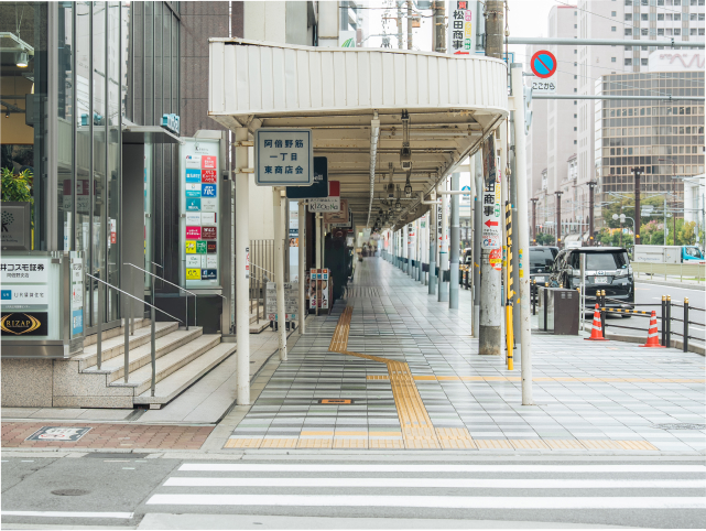 「あべのハルカス」の前を直進します。あべの筋沿いにある商店街に入っても直進します。