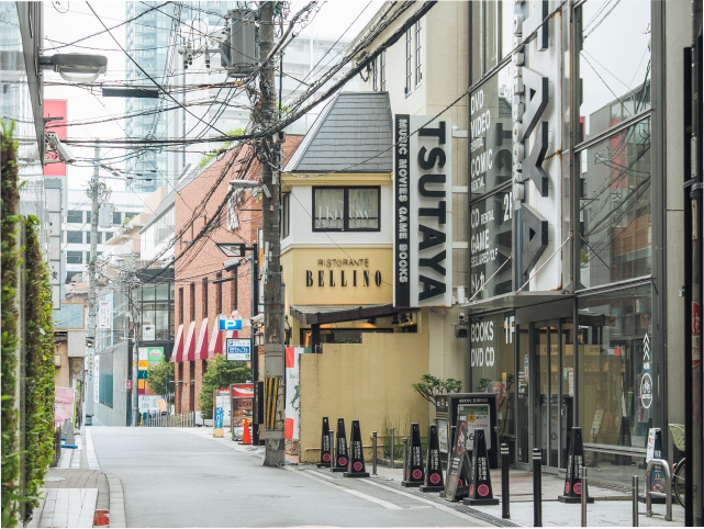 少し歩くと「TSUTAYA」が見えます。もうすぐ到着です。