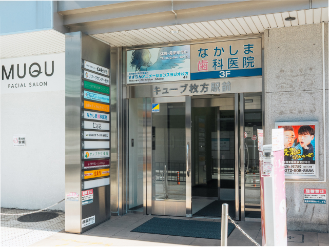 左折後、すぐにLITALICOワークス枚方第2のある「キューブ枚方駅前」がみえます。