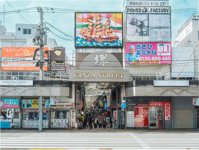 堺東駅南口交差点を右に曲がり、2分ほど直進します。