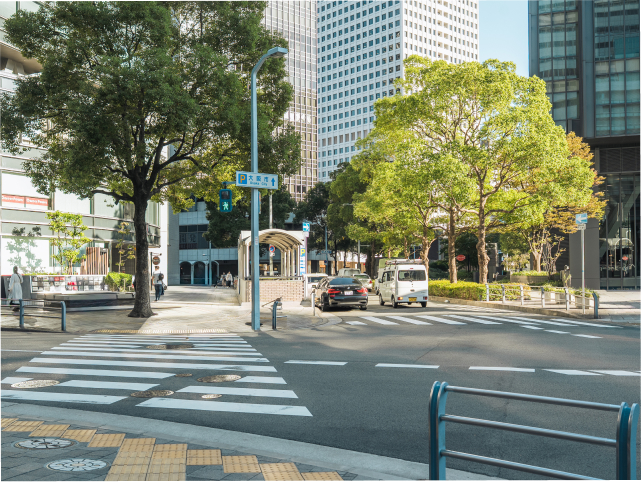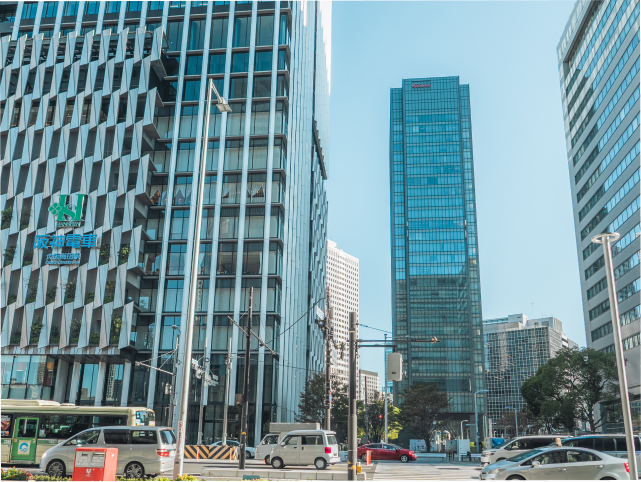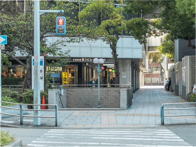 二つ目の交差点です。前方に見えるビルがLITALICOワークス大阪梅田がある第三ビルです