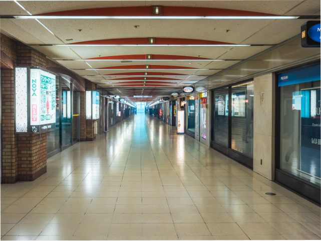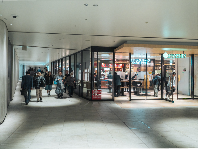 中央南口を出て正面をみた写真です。左手に阪神のビルが見えます。阪神ビルの右にみえる道をまっすぐお進みください。
