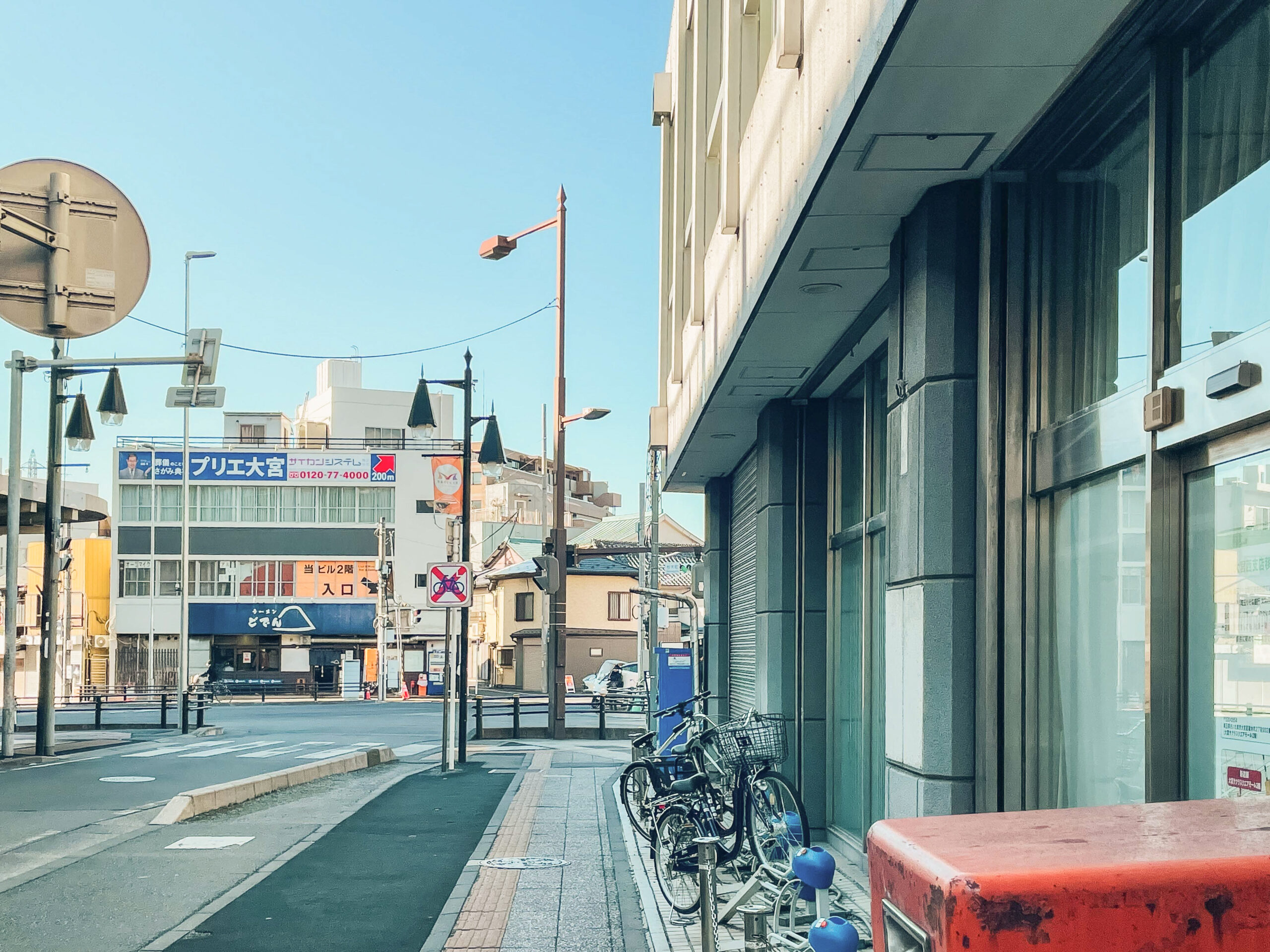 交差点手前「埼玉りそな銀行跡地」が右手に。正面にラーメン「どでん」さんが見えます。