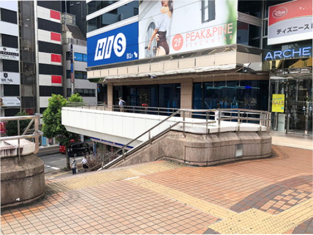 大きな歩行者デッキに出て、そのまま正面の「ARCHE(アルシェ)」ビルを目指して進み、アルシェのビルの手前まで来たら、左側の階段を降ります。