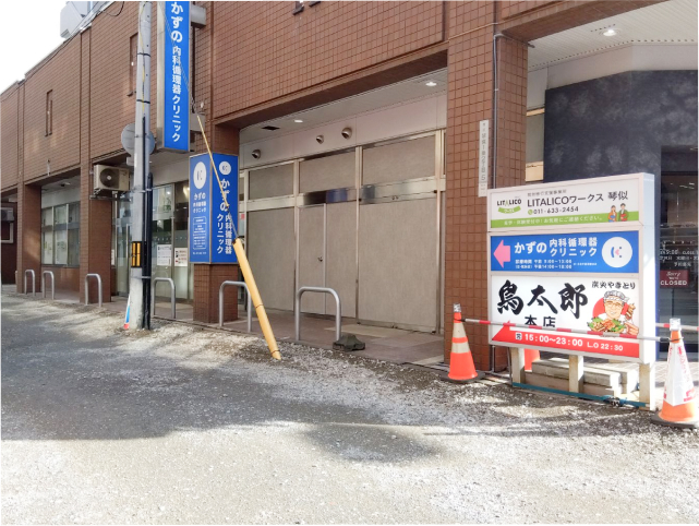 右手に串カツかすうどんビ軒リー軒を見ながらまっすぐ進みます