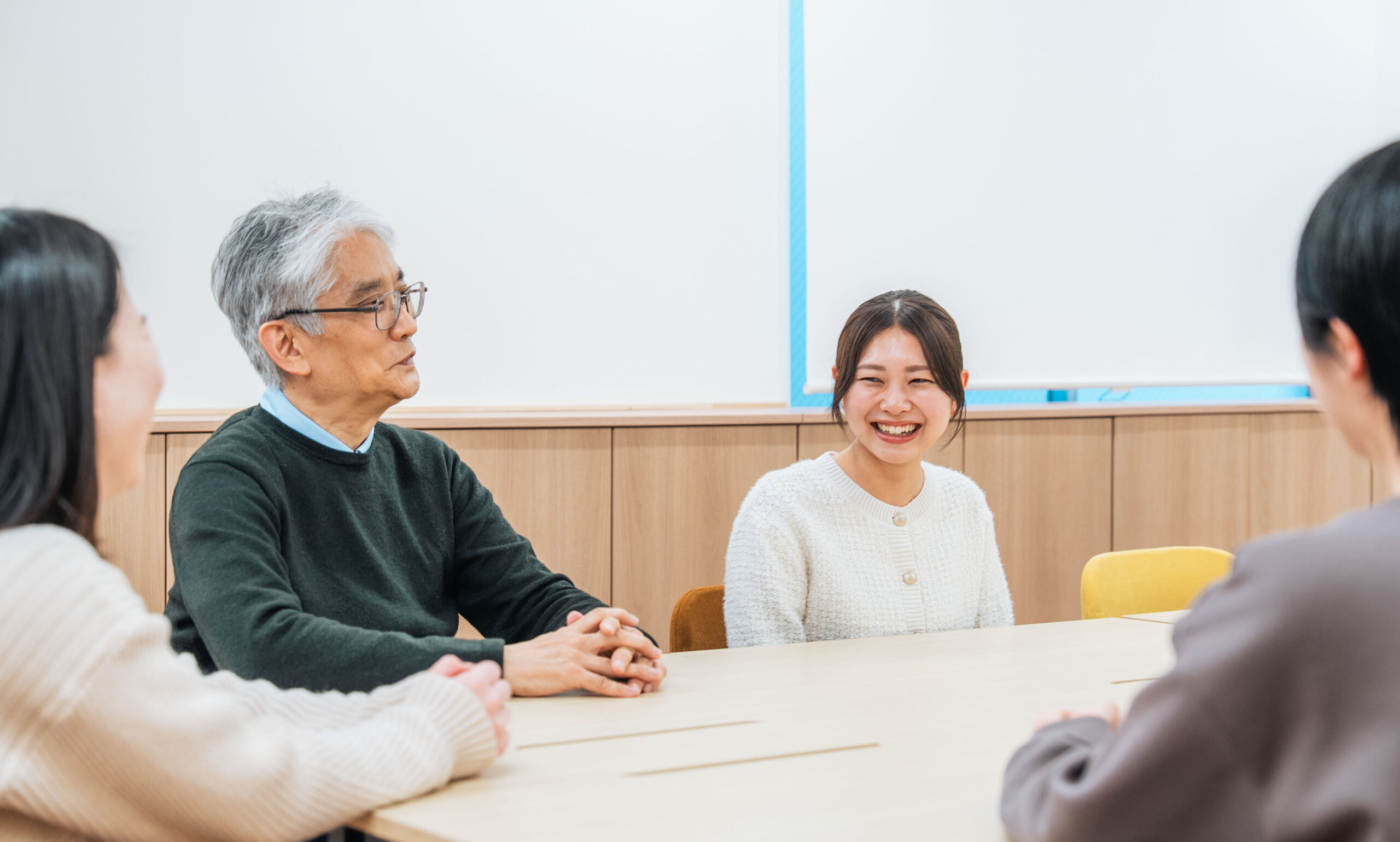 お互いの意見を尊重し、対話を楽しみながら進めるグループワークです。共通のテーマで話し合うことで、新たな気づきや仲間との絆が生まれる、活気と笑顔に満ちた大切な時間となっています。